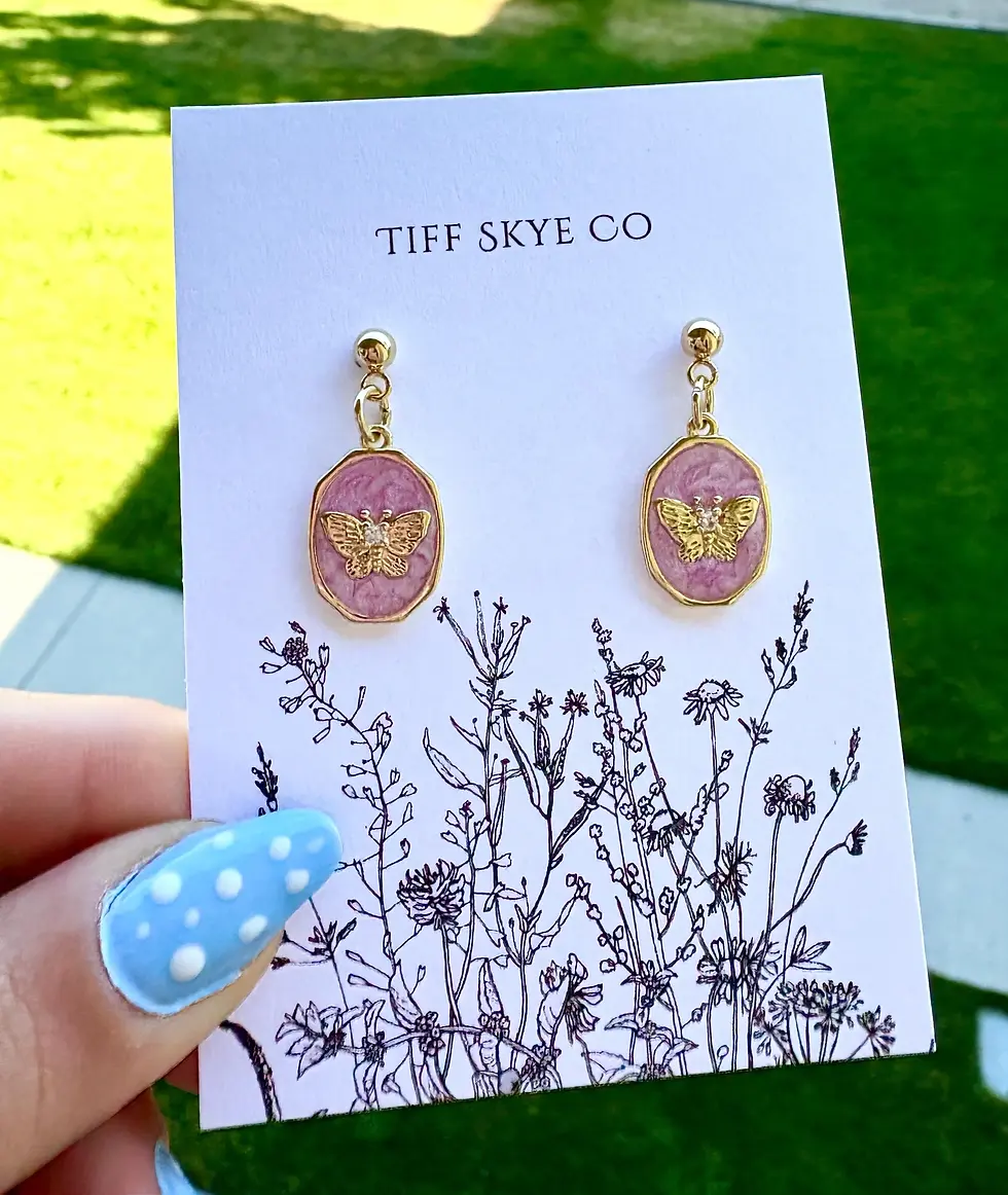 18k Gold Pink Sparkly Oval Butterfly Earrings